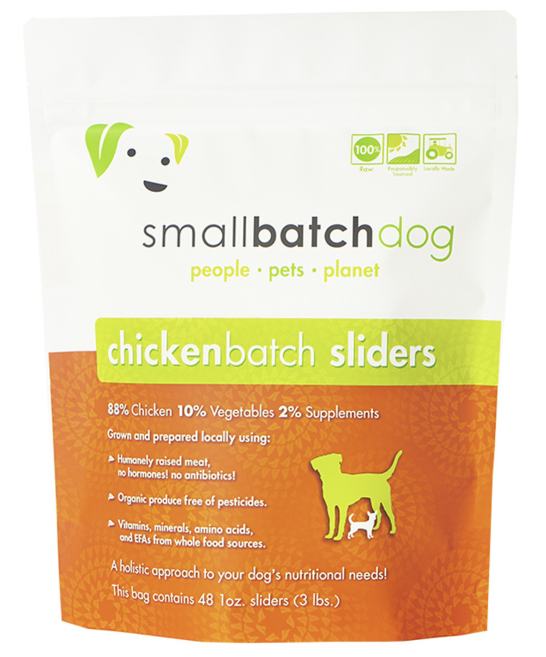 Smallbatch Chickenbatch Slidders Frozen Raw Dog Food is 88% chicken, 10% vegetables and 2% supplements.
