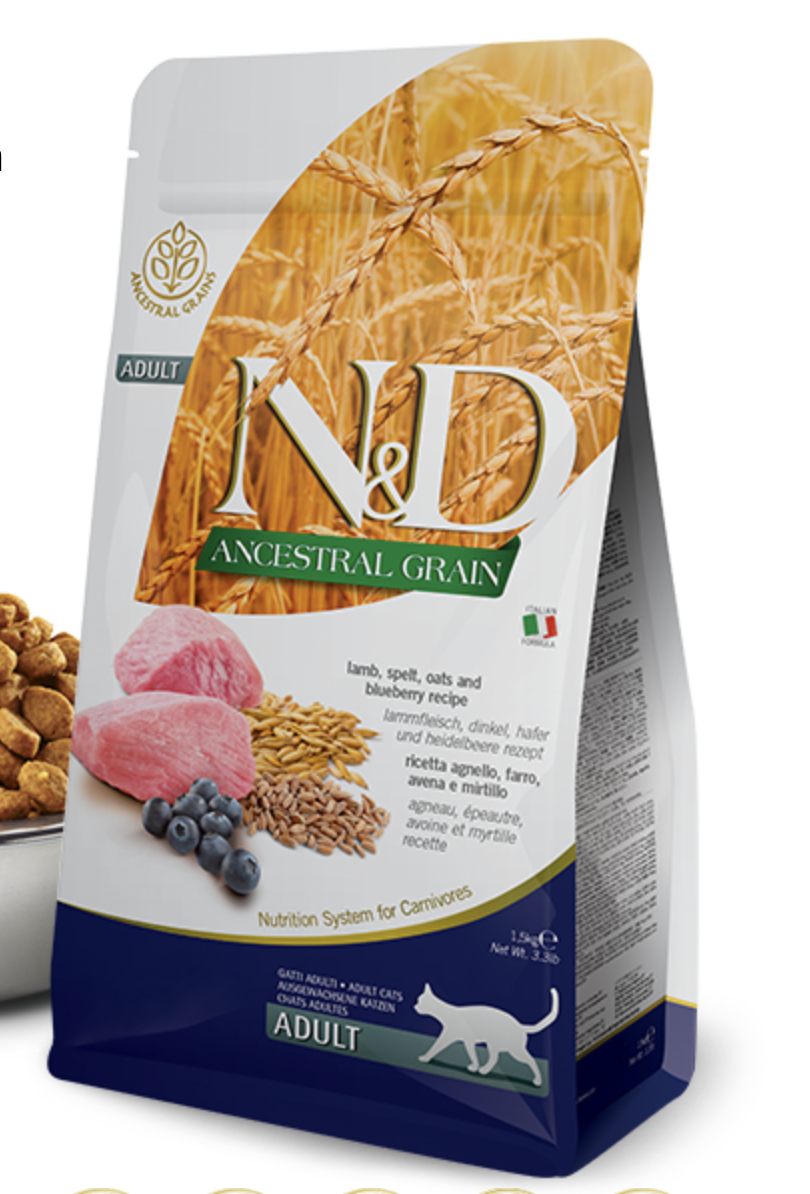 N&D Lamb, spelt, oats and blueberry recipe.is formulated to meet the nutritional levels established by the AAFCO Cat Food Nutrient Profiles for maintenance.