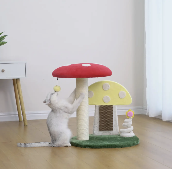PetPals Moultrie Mushroom Cat Perch and Scratcher will teleport your feline friend to an enchanted forest!! Your cat will love this whimsical wonderland, featuring a 100% natural sisal scratching post perfect for keeping those claws in check. Crafted from premium soft plush material, this perch provides cozy nap areas. It's the ideal height near a window, giving your furry friend the perfect perch view to watch the world go by. Our magical mushroom has a playful teaser toy to amuse your cat for hours! And let's not forget the adorable yellow shrub massager, adding more adorableness to this fairy-tale escape. Transform your home into a magical kingdom with our Moultrie Mushroom Cat Perch and Scratcher, where every nap and playtime feels like an adventure!